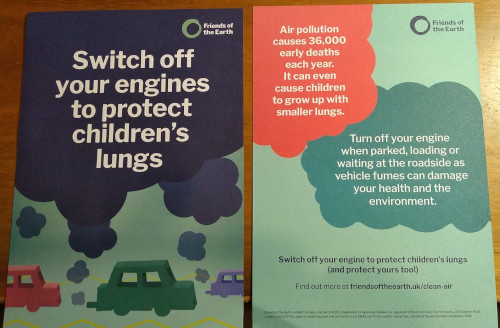 We will be educating drivers with a leaflet from Friends of the Earth with the message”Switch off your engines to protect children’s lungs” (pictured).