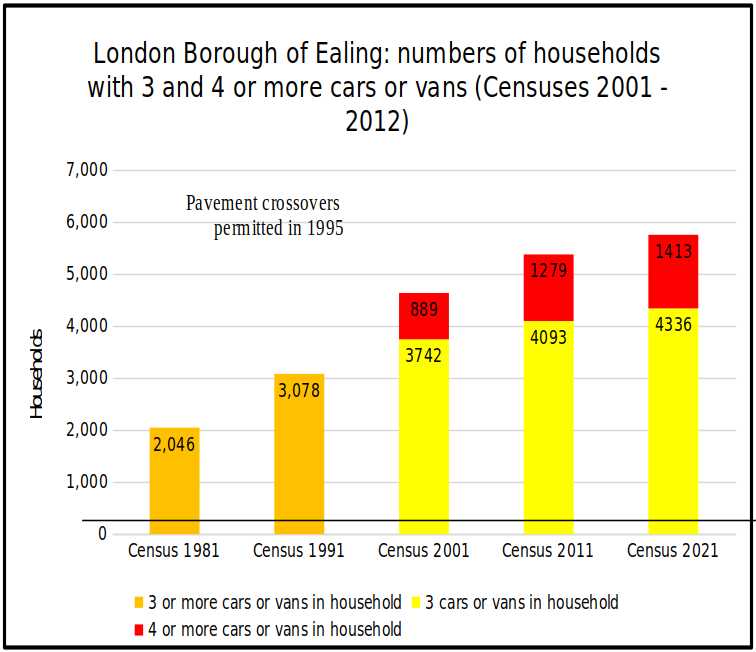 The 2021 Census has shown a further big increase in the numbers of households with three or more vehicles in the London Borough of Ealing. This is often enabled by using the entire front garden for parking.